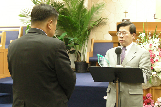 | ▲전임 회장 김기호 목사에게 감사패를 전달했다. |