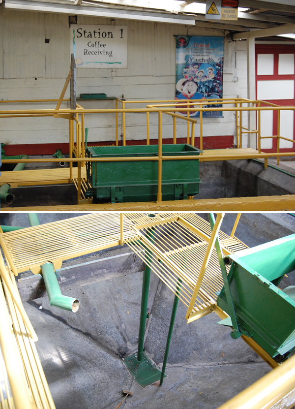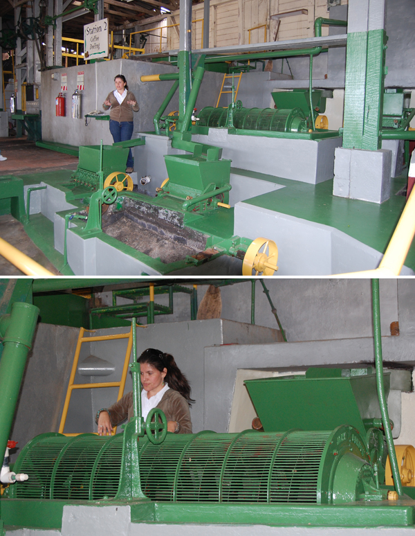 | ▲상품의 커피 열매를 큰 것과 작은 것으로 분류하는 것이 두번째 공정이다. 큰 열매는 큰 것대로, 작은 열매는 작은 것 대로 나누어 따로 가공한다. 크기에 따라 커피 열매를 분류하는 실린더(아래) | |