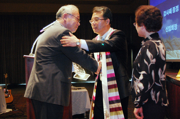 | 이승태 전 총회장에게 감사패를 전하는 정인수 목사 | |