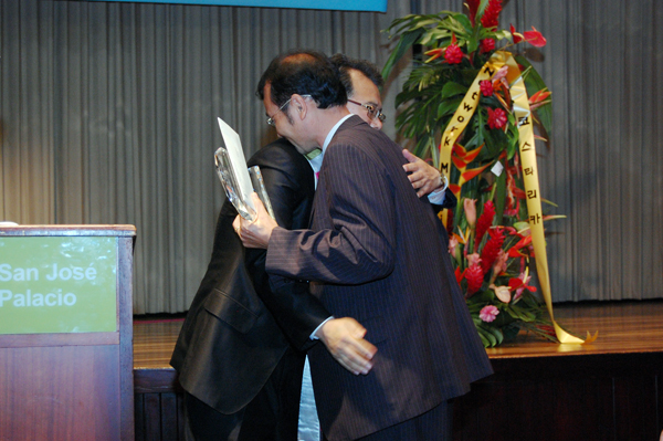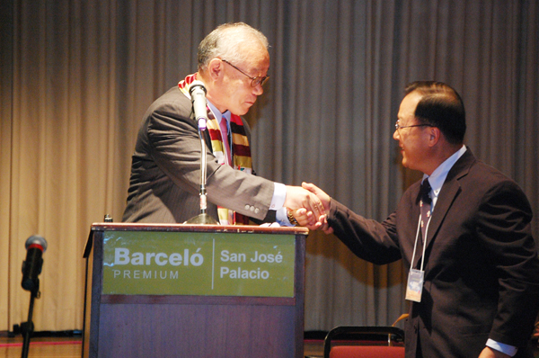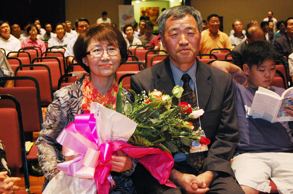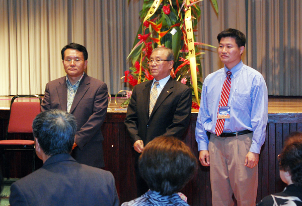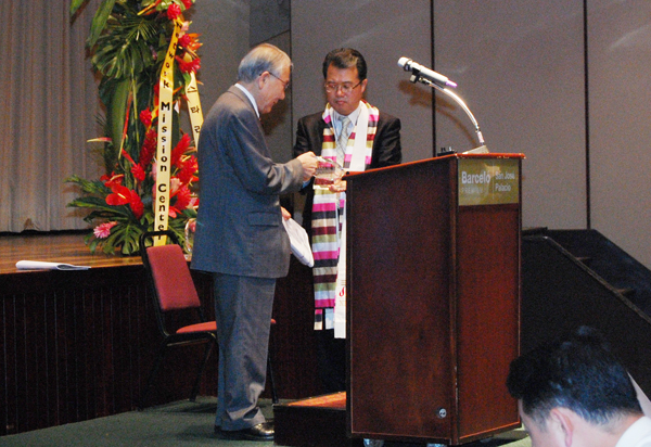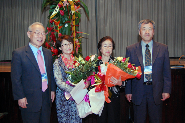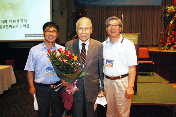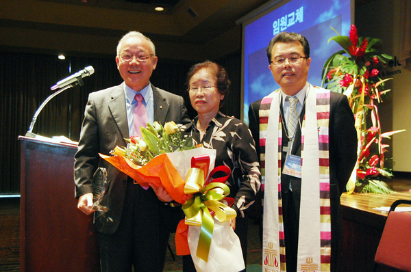 | 교단으로부터 꽃다발을 받고 있는 이승태 전 총회장 내외 | |