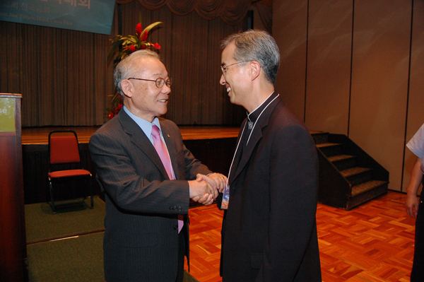 | 새 사무총장으로 취임한 문정선 목사와 악수를 나누는 이승태 총회장 | |