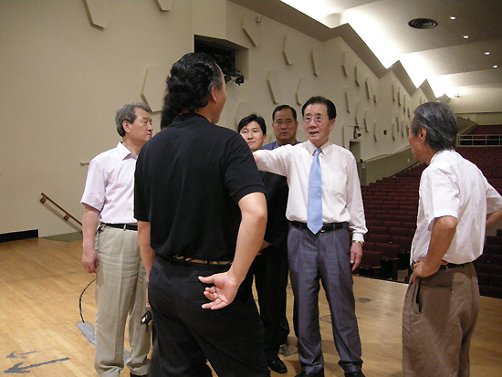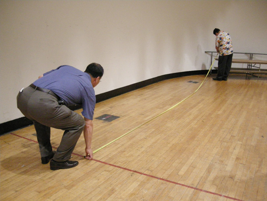 | ▲대강당 무대 가로 길이를 재는 목회자들 |
