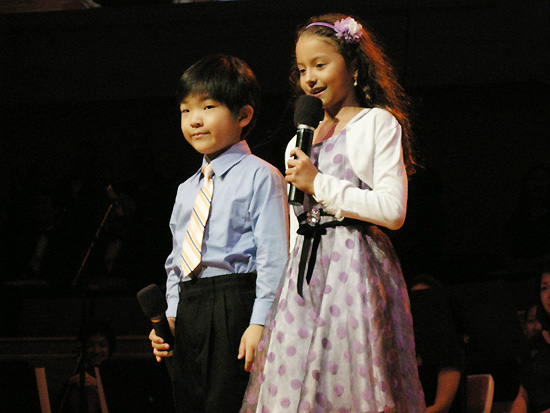 | ▲ (왼쪽부터)크리스토퍼 박 어린이는 영어로, 로래인 올라야어린이는 스패니쉬로 인사말을 전했다. 두 어린이 모두 프라미스교회에 출석하고 있다. | |