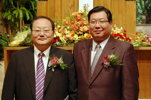 ▲(오른쪽부터)신임 회장 김원기 목사, 직전 회장 신현택 목사.