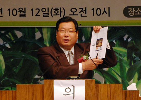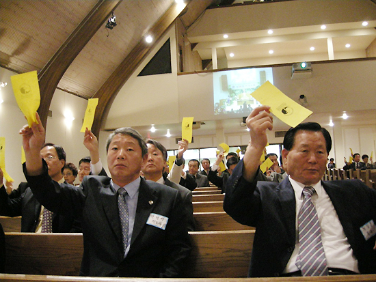 ▲청소년센터 관련 회칙 개정안을 받을 것인지 결정하기 위해 찬반 투표를 하고 난 후 정확한 인원을 세기 위해 총대들이 노란색 출석 용지를 들어보이고 있다.