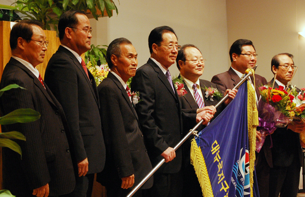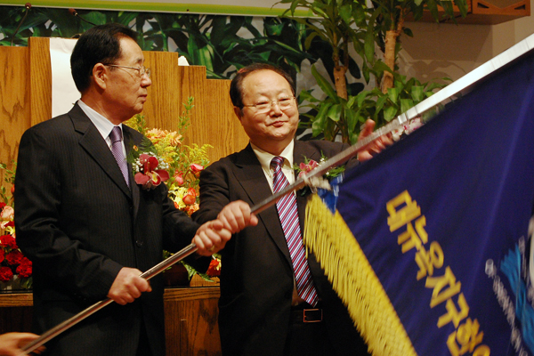 ▲교협 기를 넘겨 받는 (오른족부터)신임 회장 김원기 목사, 직전 회장 신현택 목사.