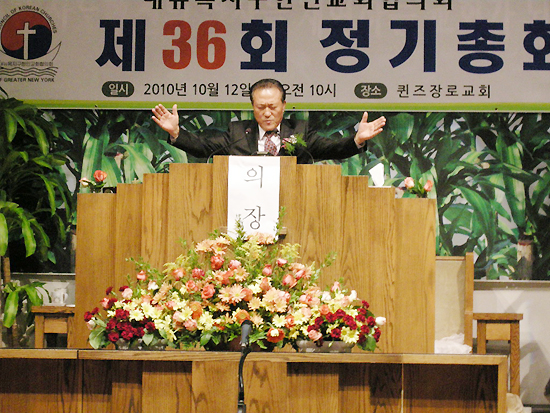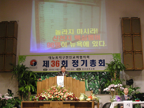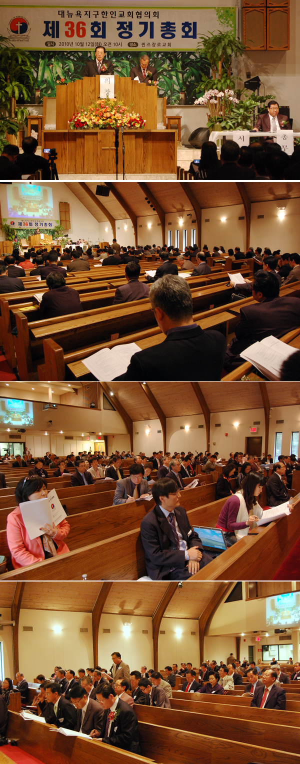 대뉴욕지구한인교회협의회 제36회 정기총회가 10월 12일 오전 10시 퀸즈장로교회(담임 장영춘 목사)에서 열렸다. 정기총회를 통해 부회장이었던 김원기 목사가 관례대로 회장에 올랐으며 이종명 목사가 투표를 거쳐 부회장에 당선됐다. 이종명 목사는 총 96표 중 70표의 지지를 얻었다. 평신도 부회장은 손석완 장로가 맡게 됐다.