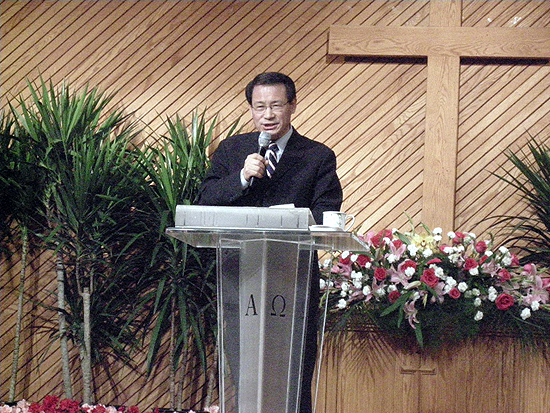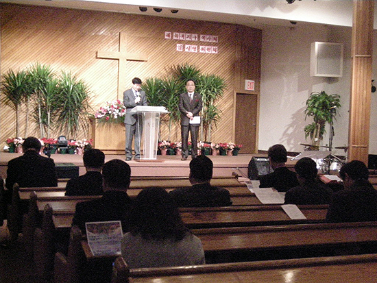 | ▶정년을 1년 앞두고 은퇴하는 이기천 목사가 다음 주일 오후 5시 진행될 은퇴예배에 관해 광고하고 있다. | |