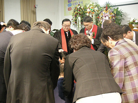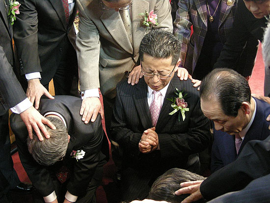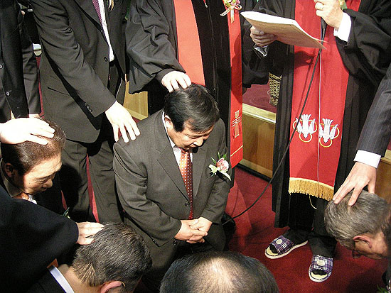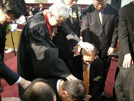 | ▲장로 임직자들에게 안수 위원들이 안수기도했다. | |
