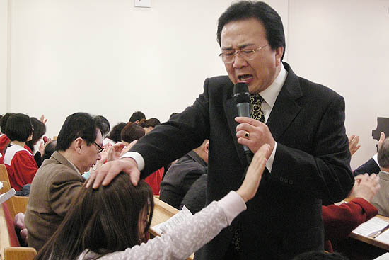 | ▲성도에게 안수기도하는 김명호 목사. | |