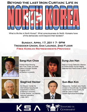 이번 북한관련 세미나는 최상훈 씨(전 뉴욕타임즈 기자, 현 Stanford Korean Studies Program Visiting Fellow)가 사회를 진행하며 , 탈북자 출신의 북한인권탈북청년연합 한성주 대표, Siegfried Hecker 교수(스탠포드 국제안보협력센터장, 핵 전문가), 김선만 목사(지난 10년간 월 1회 북한 방문해 농민들에게 현대의 과학적인 농업 기술 지도, 온실 농업 보급)가 강연한다.