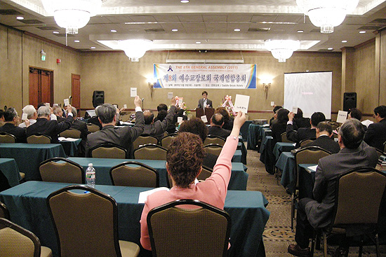 | ▲실행위원회의 결의 사항에 대한 가부를 총대들에게 묻고 있다. | |