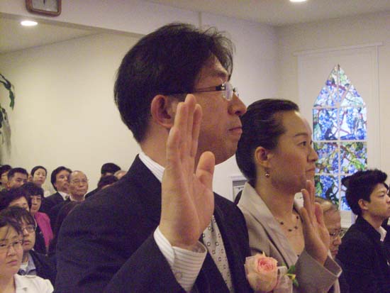 ▲(오른쪽)장로 장립한 유관하 장로 내외.
