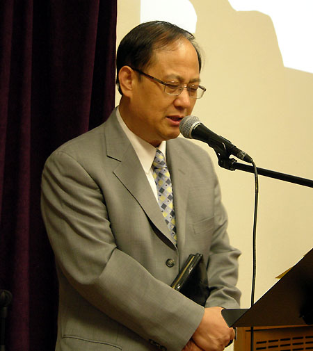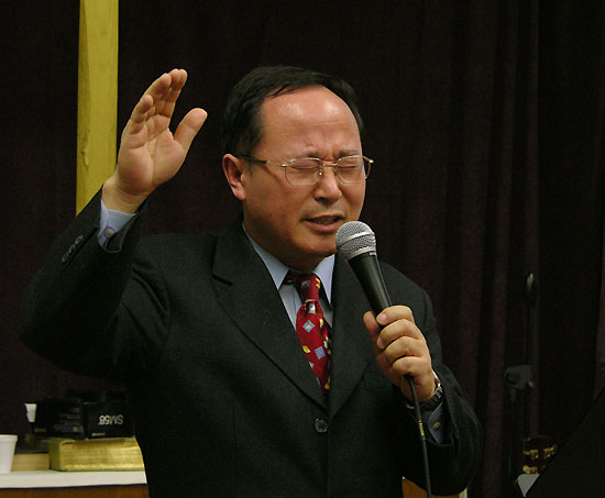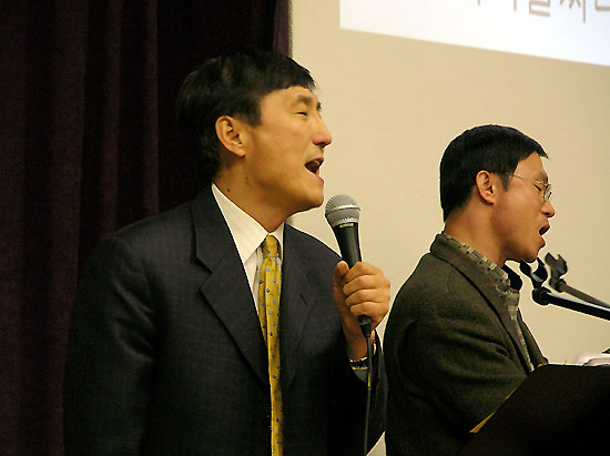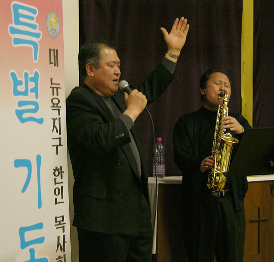 ▲섹스폰으로 찬양을 인도하고 있는 유상열 목사(우)