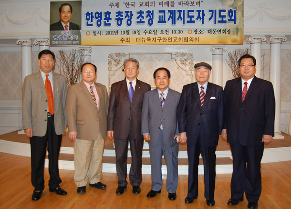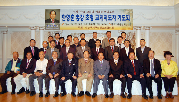 | ▲교협 임원 및 원로 목회자들과 함께한 한영훈 총장(좌로부터 네번째) | |