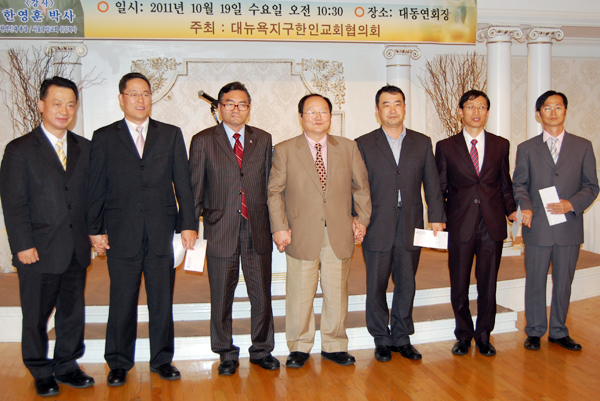 | ▲할렐루야대회 강사였던 서임중 목사의 지원으로 초, 중고생을 자녀로 둔 목회자 10명에게 각각 3백불 씩 장학금을 지급했다. 장학금을 수여한 목회자들과 함께한 총무 허윤준 목사(좌)와 회장 김원기 목사(가운데) | |