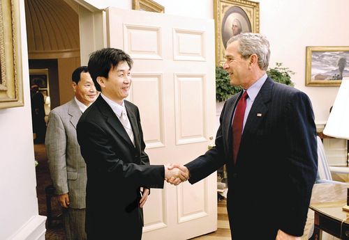 | ▲조지 W 부시 미국 대통령은 자신의 집무실인 백악관 오벌 오피스에서 탈북자 출신 조선일보 기자인 강철환씨를 맞아 악수하고 있다. 부시 대통령은 강 기자의 북한 강제수용소 체험을 담은 책에 감명받아 저자를 초청했다고 백악관측은 밝혔다. /백악관 제공 |