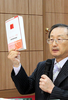 | ▲일부 가정사역자들이 전국을 다니며 교재로 쓰고 있다는 <하나되는 기쁨>을 들어 보이며 강연중인 이재실 목사. | |