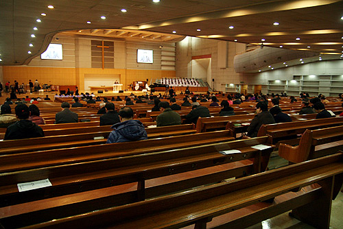 | 27일 주일 강북제일교회의 2부 예배가 진행되고 있다. 평소보다 예배를 드리는 교인들의 수가 눈에 띌 정도로 줄었다. ⓒ김진영 기자 |