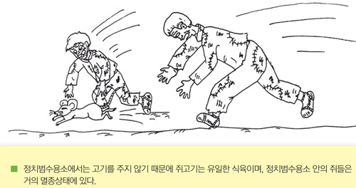 정치범이든 경제범이든 먹을 것을 제대로 주지 않아 배고픔은 극도에 달한다. 많이 먹이면 힘이 나서 반항하거나 도주할 우려가 있고, 또한 공화국의 법을 위반한 엄중한 죄를 저질렀으니 굶주리게 해야 한다는 것이다. 그래서 교화소에 갇힌 사람들은 늘 배고픔에 시달려야 하는데 일하러 가다가도 길가에 있는 이나 개똥에 묻어나온 옥수수도 그대로 집어 먹는다. 먹을 것을 가지고 서로 경쟁을 붙이던가 아니면 서로를 감시하게 한다.
