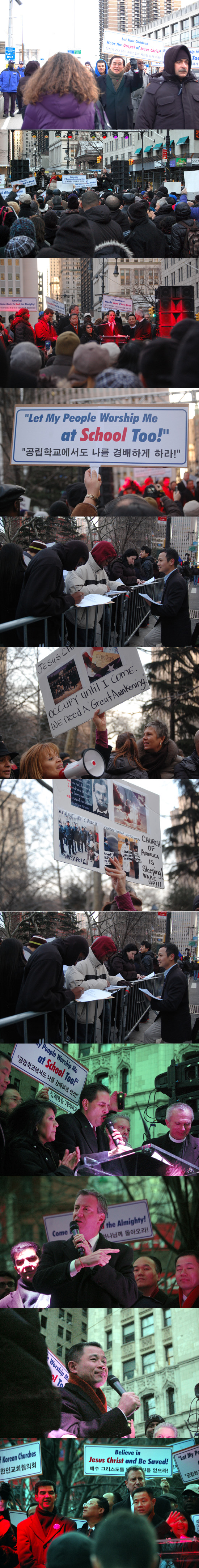 뉴욕교협 관계자들은 이날 스페인어, 영어, 한국어로 ‘미국이여 전능하신 하나님께 돌아오라’, ‘당신의 삶에서 하나님으로 하나님 되게 하라’, ‘자녀들이 그리스도의 복음을 듣게 하라’, ‘공립학교에서도 나를 경배하게 하라’ 등의 구호가 적힌 피켓을 준비했다.