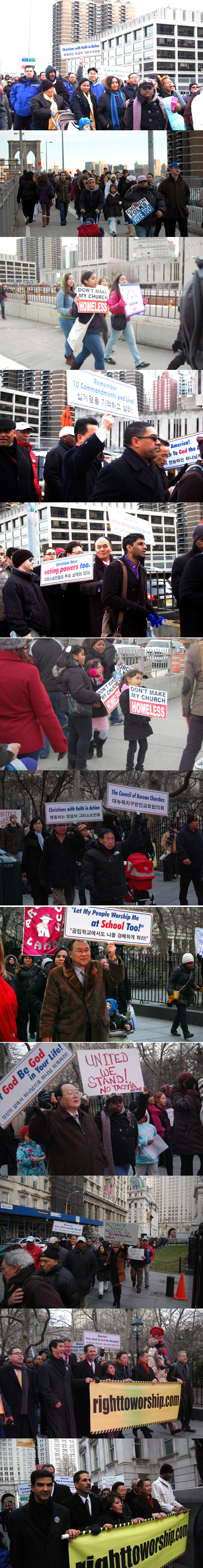 참석자들은 브룩클린브릿지를 행진 한 이후 뉴욕시청 앞으로 이동해 기도집회를 열었다. 참석자들은 함께 찬송을 부르며 뉴욕시가 예배의 자유를 허락할 것을 촉구했으며 카브레라 의원과 존 리우 감사원장 등의 정치권 인사들의 발언도 이어졌다.