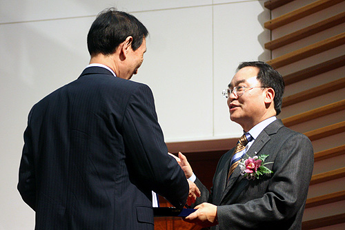 ▲림형천 목사(오른쪽)가 원광기 목사(왼쪽)에게 원로목사추대패를 증정하고 있다. ⓒ신태진 기자