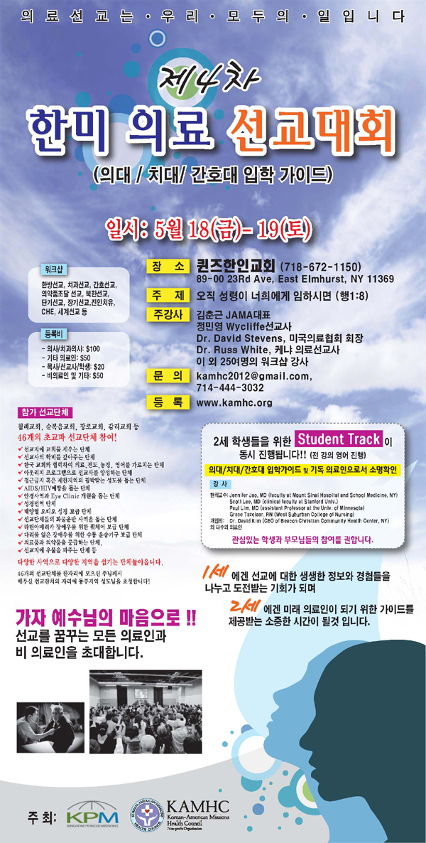 미동부지역 1세와 2세 의료인들에게 선교의 비전을 심고 미동부지역의 효율적 의료선교 인프라를 구축하기 위한 한미의료선교대회가 오는 5월18~20일까지 퀸즈한인교회(담임 이규섭 목사)에서 개최된다.
