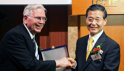 ▲감경철 회장(오른쪽)이 로버트 거버 선교사(왼쪽)에게 감사패를 전달하고 있다. ⓒ신태진 기자