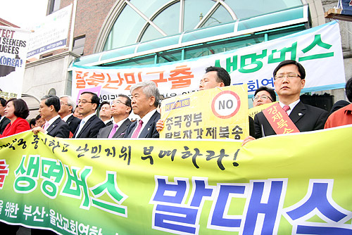 ▲중국의 탈북자 강제북송 중단을 위한 시위가 진행되고 있다.