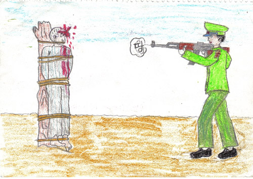강냉이 몇 킬로그램을 훔쳤다고 공개처형 되는 북한의 현실에 우리는 얼마나 더 침묵하려는가( 탈북자 장한길이 중국 은신처에서 그린 공개처형 장면, 북한인권국제연대 제공)