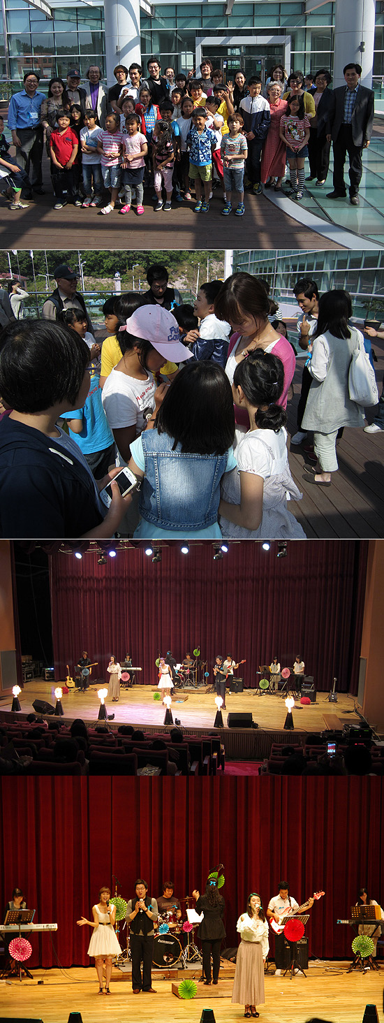 | ▲5월26일 열린 전남 완도 공연 모습. 이노비 공연자 관계자들이 청소년, 아동들과 함께 어울리면서 사인을 하고 있다. | |