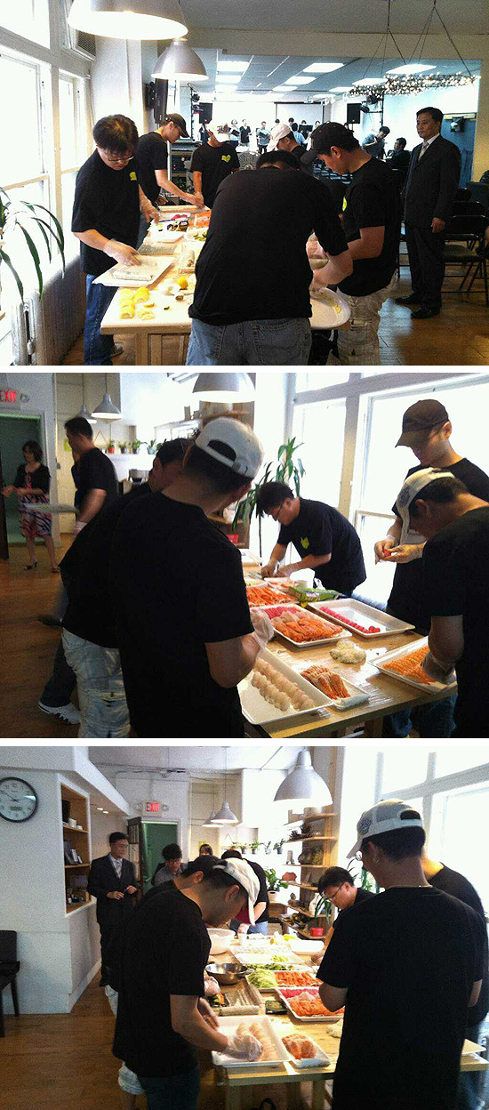 한마음회 회원 요리사들은 10일 뉴욕정원교회에서 열린 ‘유학생 초청 한마음 잔치’를 준비하기 위해 오전 일찍부터 교회를 찾았다. 직접 광어, 연어 등의 재료들을 공수해 와 현장에서 직접 다양한 초밥과 롤을 제작했다.