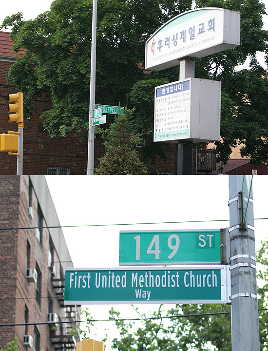 앞으로 뉴욕 플러싱 38가와 루즈벨트 에비뉴 사이 149가 선상은 후러싱제일교회의 영어명칭인 ‘First United Methodist Church way’로 정식 사용된다.
