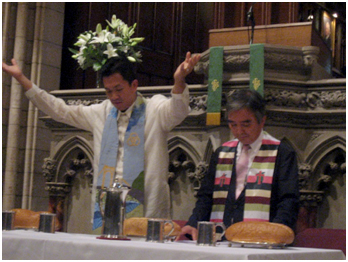 | ▲한국총회 서기 김동운 목사와 성찬을 공동집례하고 있는 총회장 프레사 목사 | |