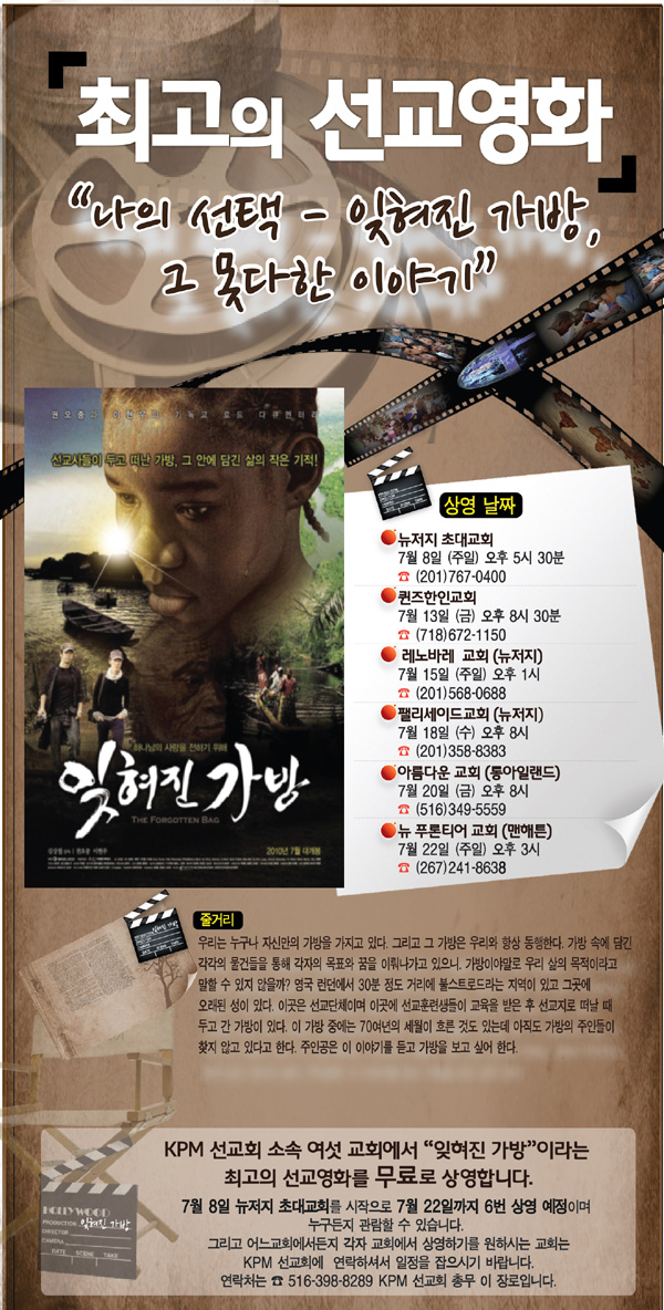 선교영화로 교회 안팎으로 큰 반향을 일으키며 사회적인 이슈까지 됐던 기독 다큐멘터리 ‘잊혀진 가방’이 뉴욕과 뉴저지 연합선교단체인 KPM 회원교회에서 릴레이로 상영된다.