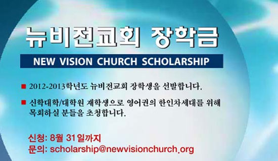 대상은 영어권 한인2세 신학대학원 재학생으로 8/31일(금)까지 장학금 신청서를 작서해 이메일 scholarship@newvisionchurch.org로 신청하면 된다.