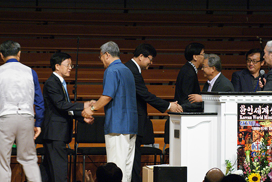 또 예배 중에는 KWMF 전임 회장단 및 사무총장, 신임 회장단 및 사무총장이 참석자들에게 인사하고 서로 악수를 나누며 격려하는 시간을 갖기도 했다.