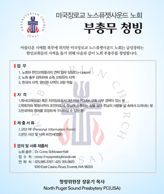 미국장로교 놀스 퓨젯사운드 노회는 급성장하는 한인교회들의 사역을 돕기 위해 노회 부총무를 청빙한다.