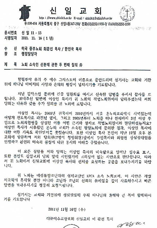 신일교회는 청빙 과정에서 이같은 여러 문제들 때문에 이상인 목사가 안수를 받은 KPCA 중앙노회 측에 질의서를 2차례나 발송했다. 첫번째 질의서에는 △이 목사의 안수 과정을 상세히 설명해 달라 △귀 노회가 이 목사를 온누리교회에 전도목사로 파송한 일이 있는가 △이상인 목사가 현재 귀 노회 소속인가? 저희는 이 목사가 2007년 무임 처리돼 귀 노회의 회원권 상실상태로 파악하고 있다 △귀 노회의 회원권 상실상태에서 서울노회로 이명증서를 해줄 수 있는지 확실한 답변을 요청한다 등의 내용이 담겼다.