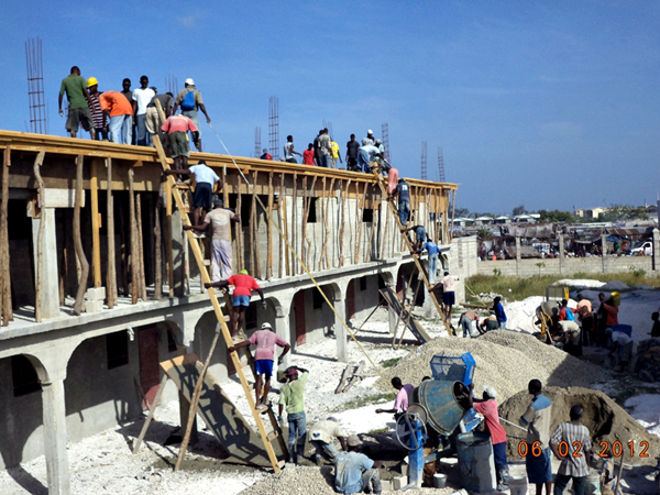 | ▲클리닉 건물 2층 지붕 콘크리스 타설 작업 . 약 130여 명의 시티 솔레이 사람들이 인부로 동원되었다. 지상에서 콘크리트를 만들면 이것을 작은 통에 담아 사람과 사람으로 이어받기하여 사다리를 통해 지붕까지 전달한다. 기계와 장비를 동원할 수도 있었지만 지역 주민들과의 관계와 일자리 창출을 이유로 가능한 많은 사람들이 일할 수 있는 방향으로 건축 사역을 진행했다. 그 결과 재정적 어려움과 공사 기간의 지연이 있었지만 이 센타 건축으로 인하여 그동안 시티 솔레이 일자리 창출에 큰 도움을 주었다.그리고 현지 주민들과의 관계가 좋아졌고, 이 센타 건축에 주민들이 직접 참여 했기에 앞으로의 사역에 대한 전폭적인 지지를 받을 수 있게 되었다고 한다. |