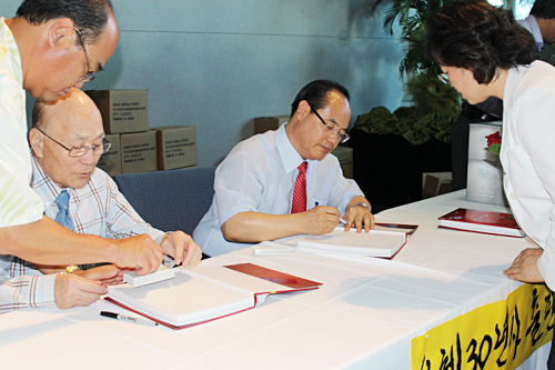 | ▲김광신 원로목사(왼쪽)와 한기홍 목사(오른쪽)가 교회 창립기념 사업의 일환으로 새롭게 출간된 '은혜 30년사'에 사인하고 있다. | |