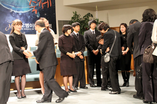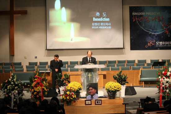 ▲천국환송예배는 문창선 타코마제일침례교회 원로 목사의 축도로 마쳤다. 옆에 보이는 김종인 목사는 집례동안 참았던 눈물을 예배가 마치가 닦고 있다.ⓒ김브라이언 기자