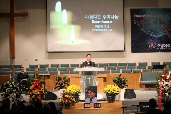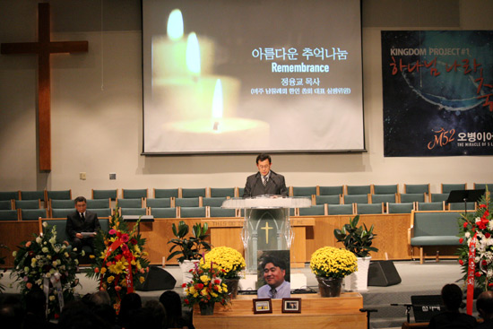 ▲미주남침례회 한인교회총회 총회장 김승호 목사도 조의문을 보내 가족들을 위로했다. 이날 조의문은 미주 남침례회 한인총회 실행위원인 정융교 목사가 대독했다.ⓒ김브라이언 기자