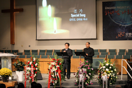 ▲생전 가깝게 교제했던 김태윤 목사와 김민경 목사가 조가로 고인의 천국행을 축복했다ⓒ김브라이언 기자