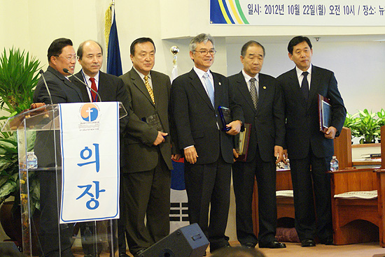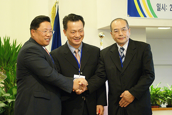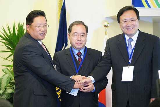 | ▲양승호 직전회장, 김승희 신임 부회장, 김종훈 신임 회장(좌측부터) | |