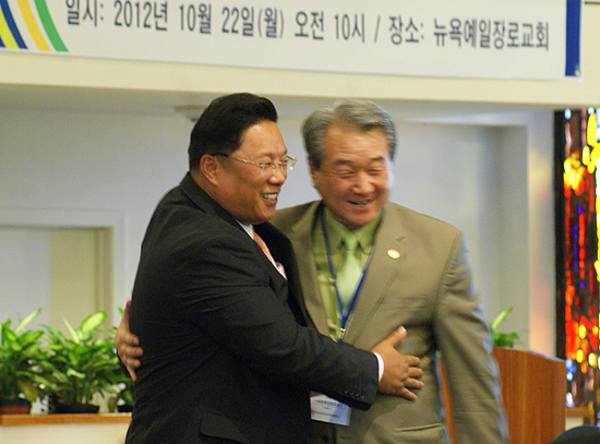 | ▲양승호 직전회장이 증경회장 황경일 목사와 포응하며 38회기를 마무리지었다. | |