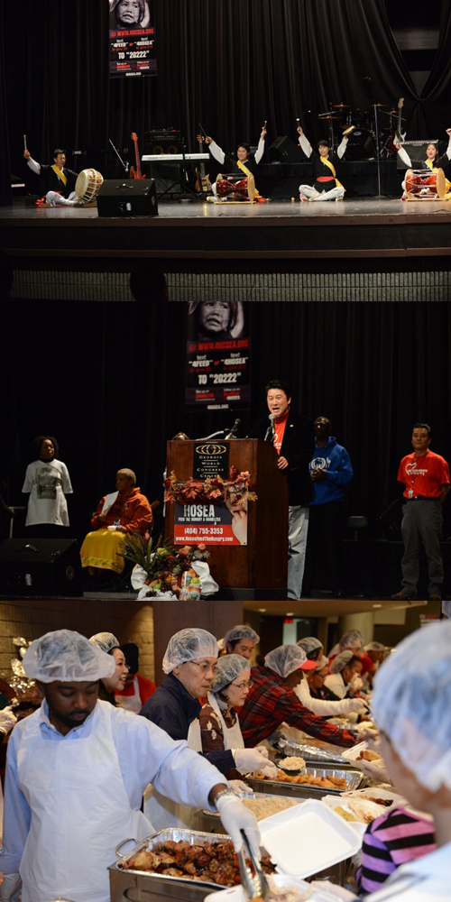 먼저, 미션아가페(대표 제임스 송)에서 애틀랜타 최대 노숙자 구제 봉사단체 중 하나인 '호세아 피드 더 헝그리(대표 엘리자베스 오밀라미)'와 손잡고 다운타운 월드콩그레스센터에서 약 11,000명의 어려운 이웃과 노숙자들에게 음식과 공연, 무료 전화, 어린이 선물, 미용 등을 제공했다.