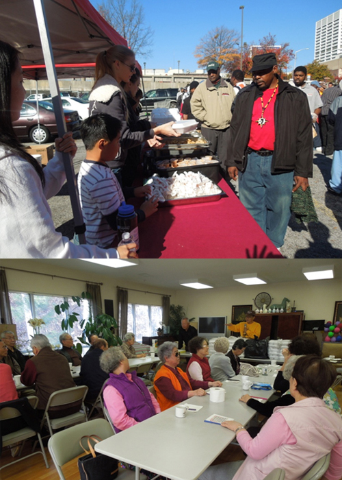 추수감사주일에는 실로암교회(담임 신윤일 목사)에서 다운타운을 찾아 섬겼고, 수요일에는 새날장로교회(담임 유근준 목사)에서 노숙자들에게 초청해 푸짐한 음식을 나누며 감사를 되새겼다. 추수감사절 당일에는 카니하우스(박영규 사장)에서 제공한 음식과 함께 사랑의 담요 나누기 행사를 통해 그 동안 기부 받은 겨울 용품과 옷, 담요, 신발 등을 헐벗은 이들에게 나누기도 했다. 이후 한인 노인아파트를 찾아 도시락 70여 개를 전달하고 어르신들을 위로하는 시간도 가졌다.