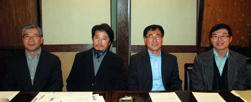 | ▲특별회화전에 대해 소개하고 있는 관계자들(왼쪽부터 조현성 교수, 정민우 화백, 김창환 총장, 김삼영 기획실장) |